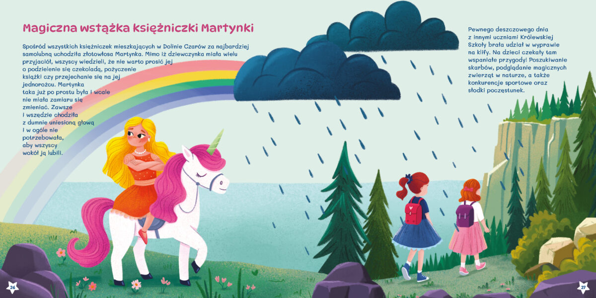 Odwiedź tajemniczą Dolinę Czarów pełną wróżek, jednorożców i księżniczek. Poznaj bohaterki, które nie boją się marzyć, wierzą w moc przyjaźni oraz magii, a poza tym nigdy się nie poddają. Przed tobą zbiór bajeczek, dzięki którym i ty nauczysz się, że warto spełniać marzenia, pomagać innym i wierzyć w siebie.