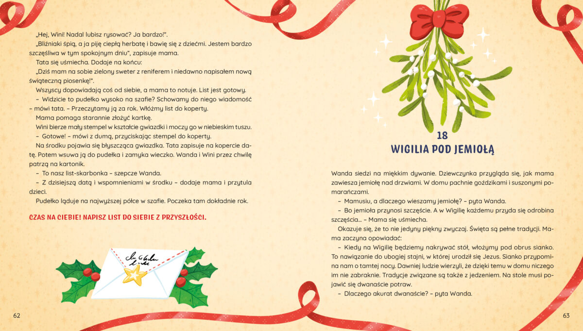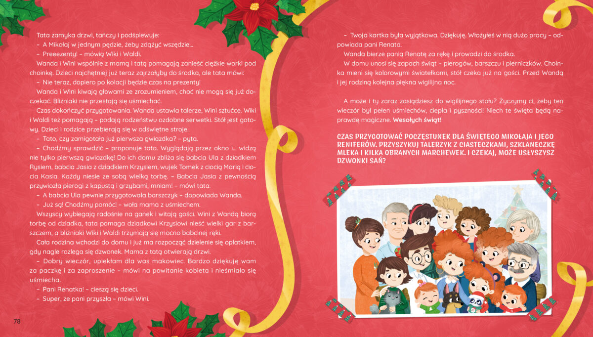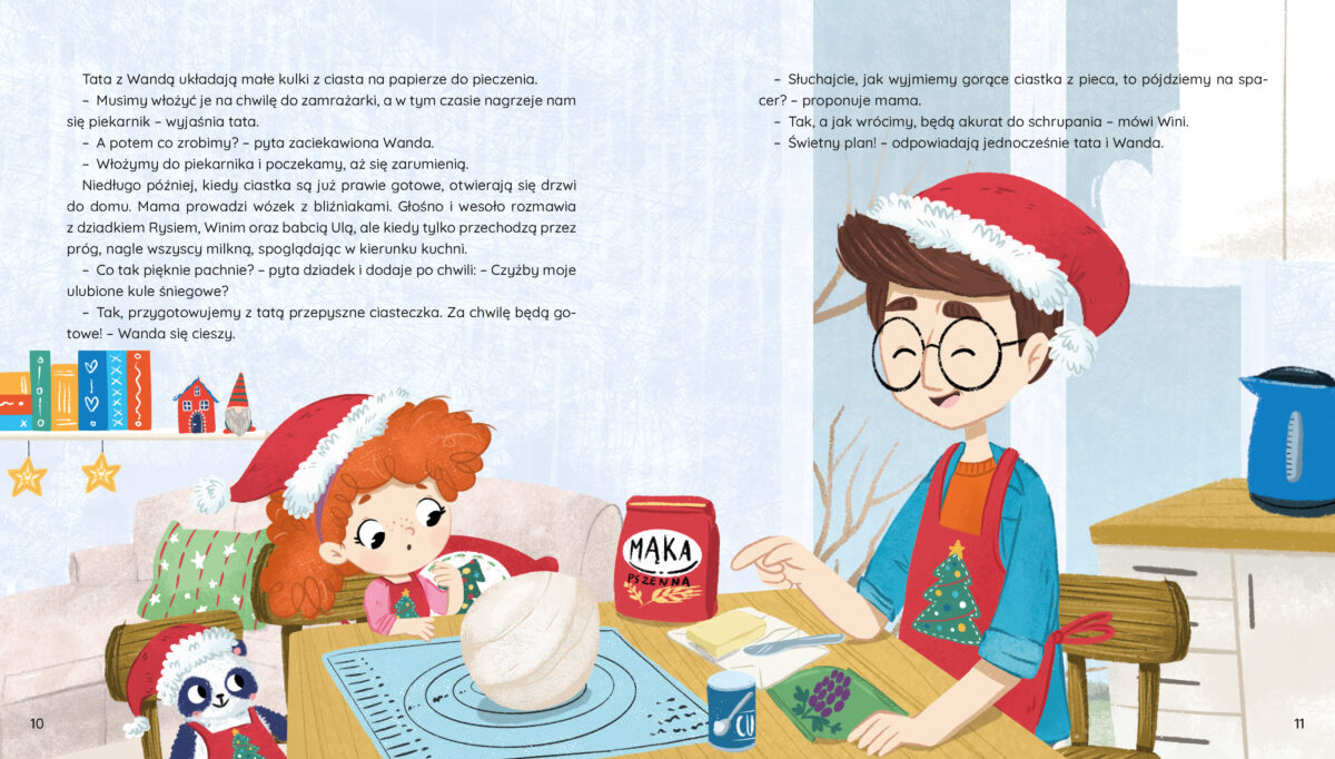 Każdy z rozdziałów to inna przygoda – pieczenie ciasteczek, tworzenie ozdób, odkrywanie świątecznych tradycji z całego świata i pomaganie innym. W środku znajdziesz też pomysły na wspólne zabawy, przepisy i kreatywne zadania, dzięki którym razem przygotujecie się do świąt.